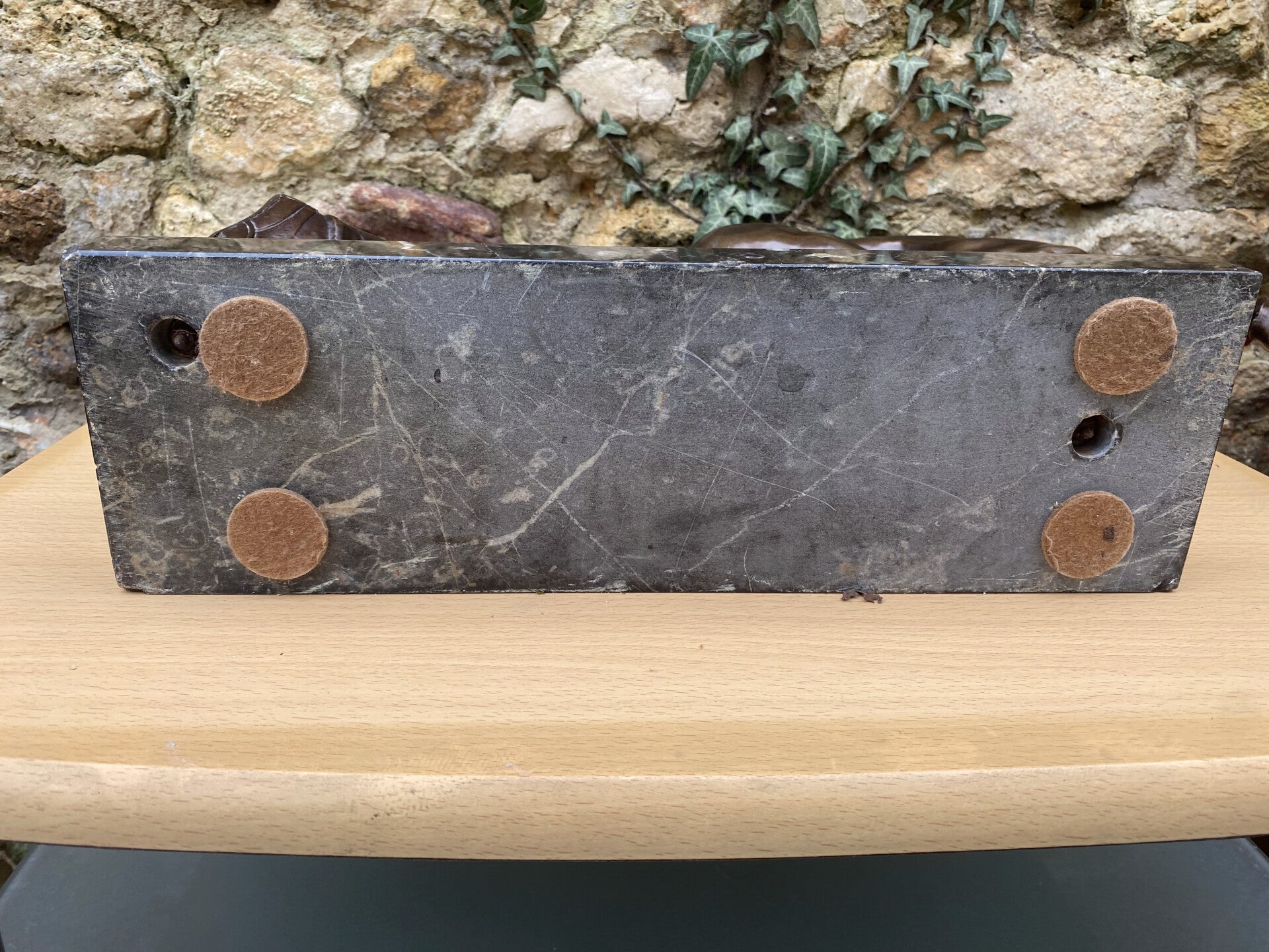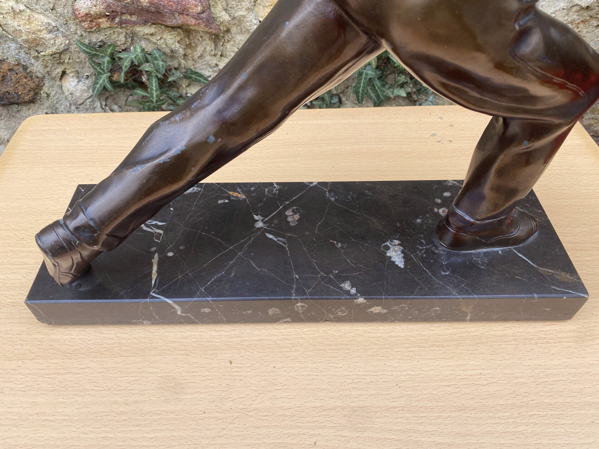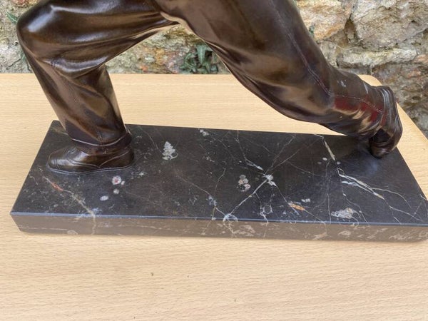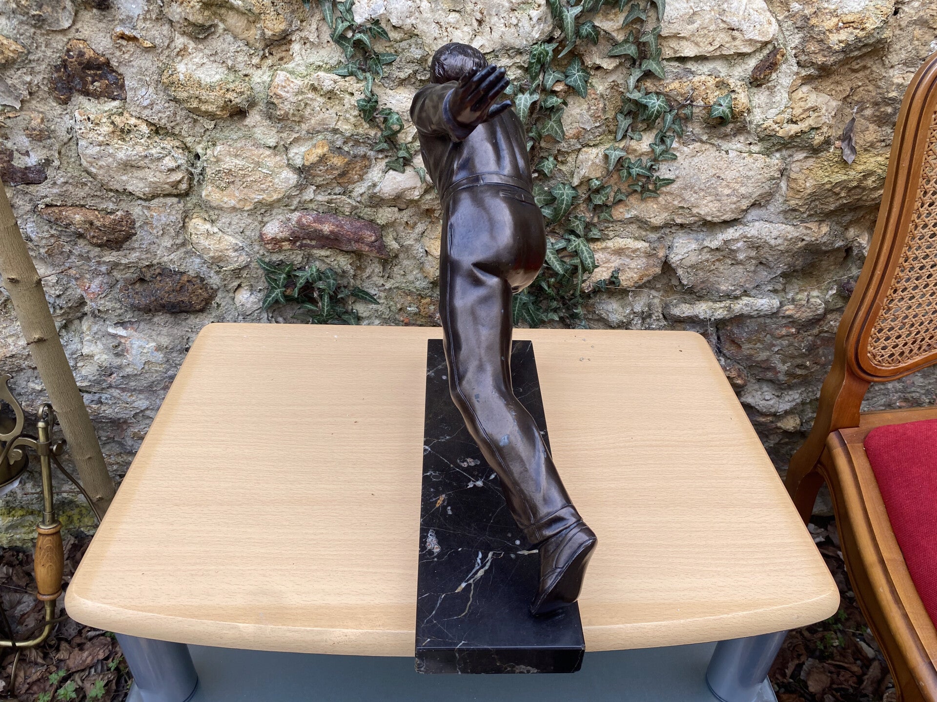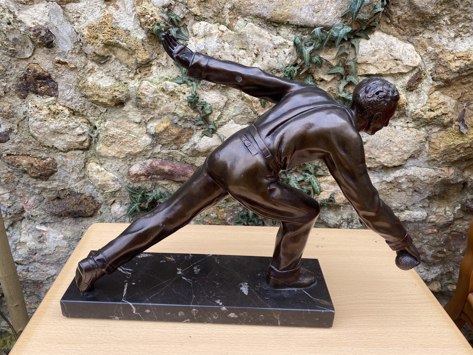 Belle sculpture en régule représentant un joueur de pétanque en pleine action. Son dynamisme et son élégance en font une pièce de décoration originale et pleine de caractère. Elle repose sur un socle en marbre noir, apportant stabilité et raffinement.