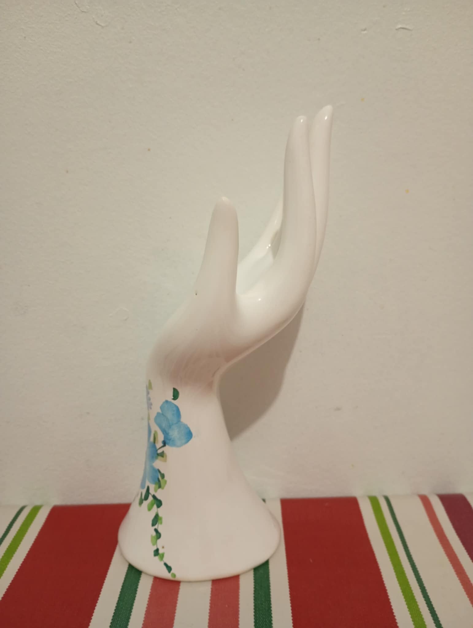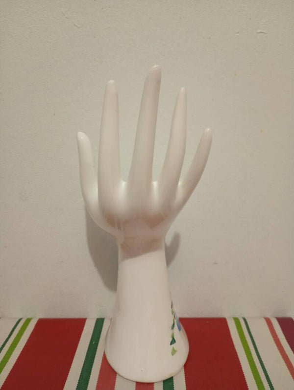 Découvrez ce porte-bijoux en forme de main, une création en céramique émaillée blanche, entièrement décorée à la main.
